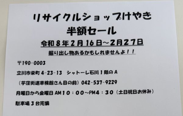 本日2/16(月)から2/27(金)まで、半額セール開催!!
